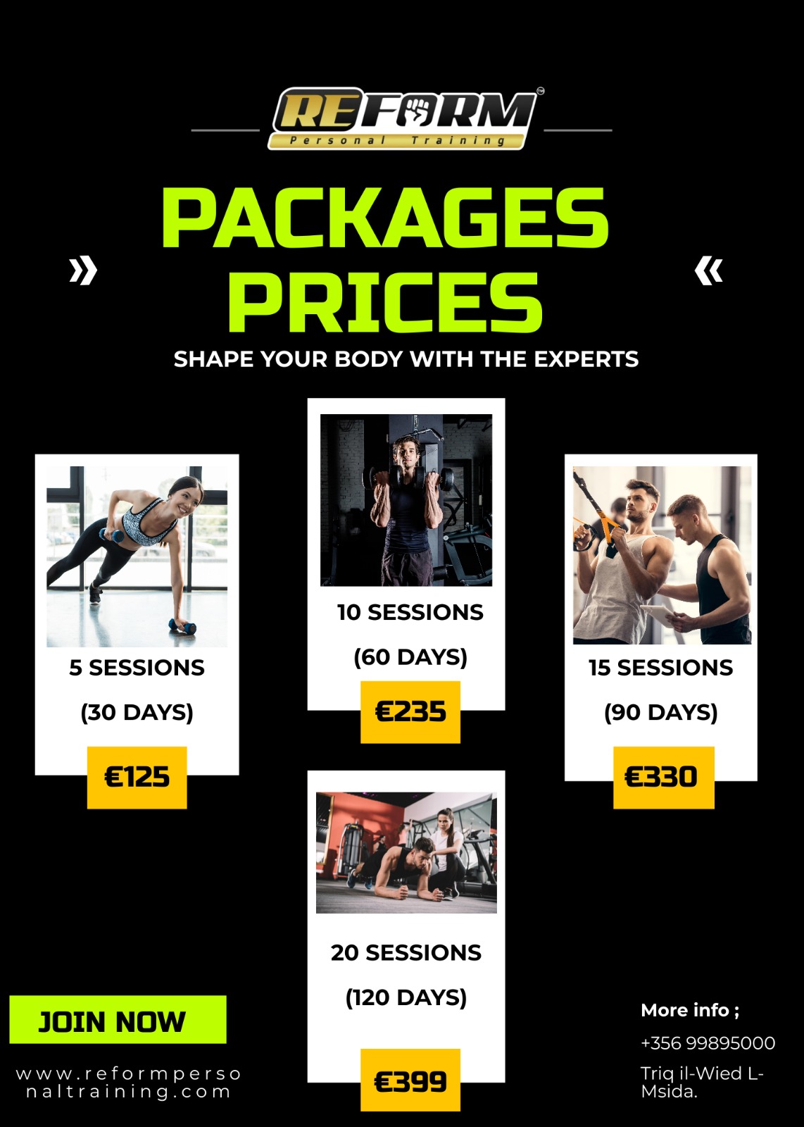 1 on 1 personal training sessions hosted at our fully equipped Msida Studio.